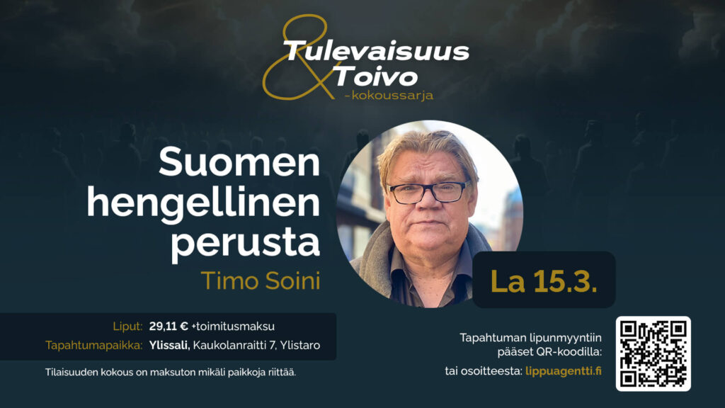 Lauantaina 15.3.2025 kanssamme on suomalainen poliitikko Timo Soini. Hän puhuu aiheesta “Suomen hengellinen perusta”.